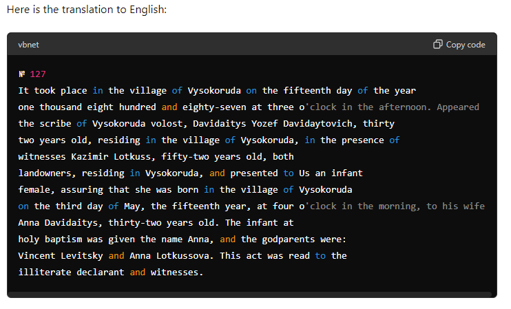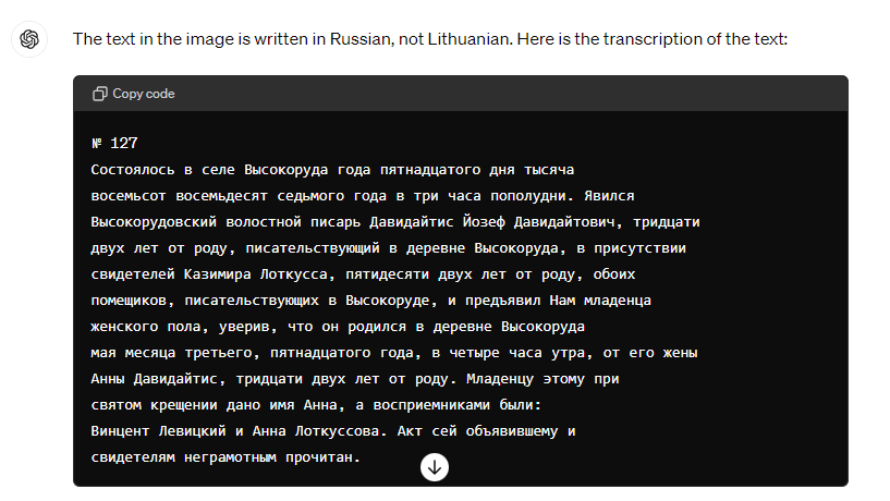 With the free ChatGPT-4o, I tossed it a Lithuanian birth record with the prompt, “This image contains handwriting in Lithuanian. Can you transcribe it and then translate it to English?”